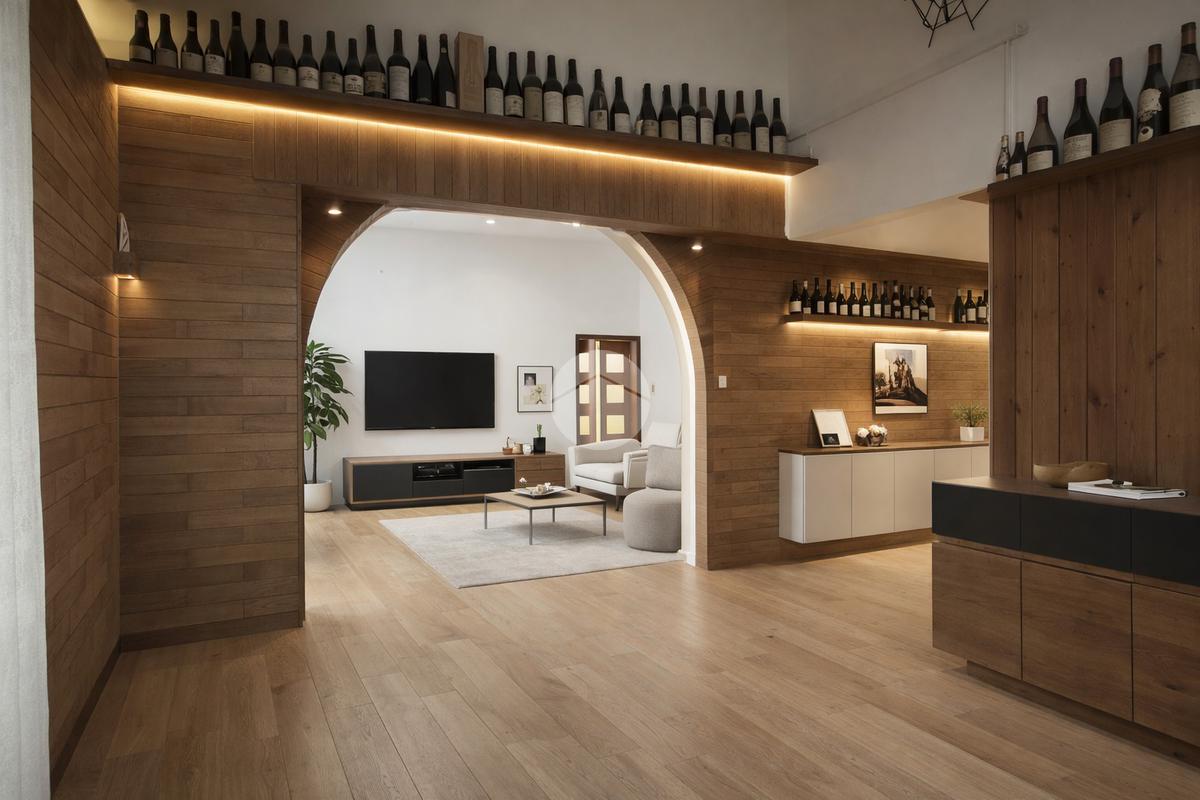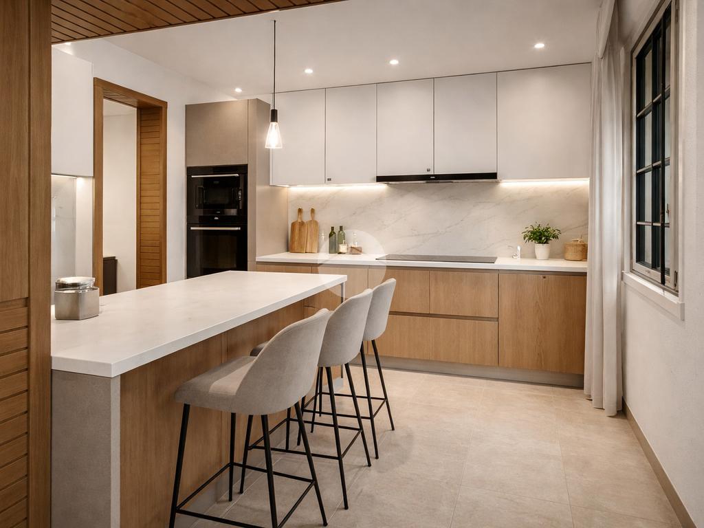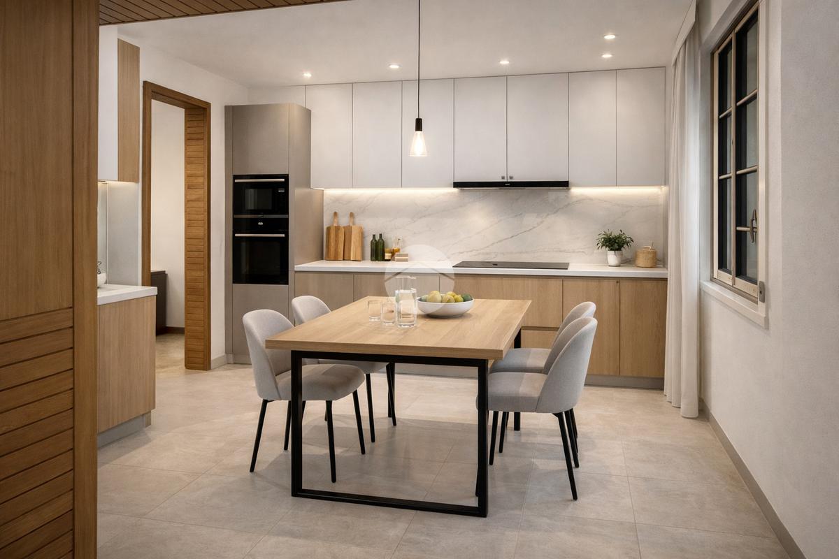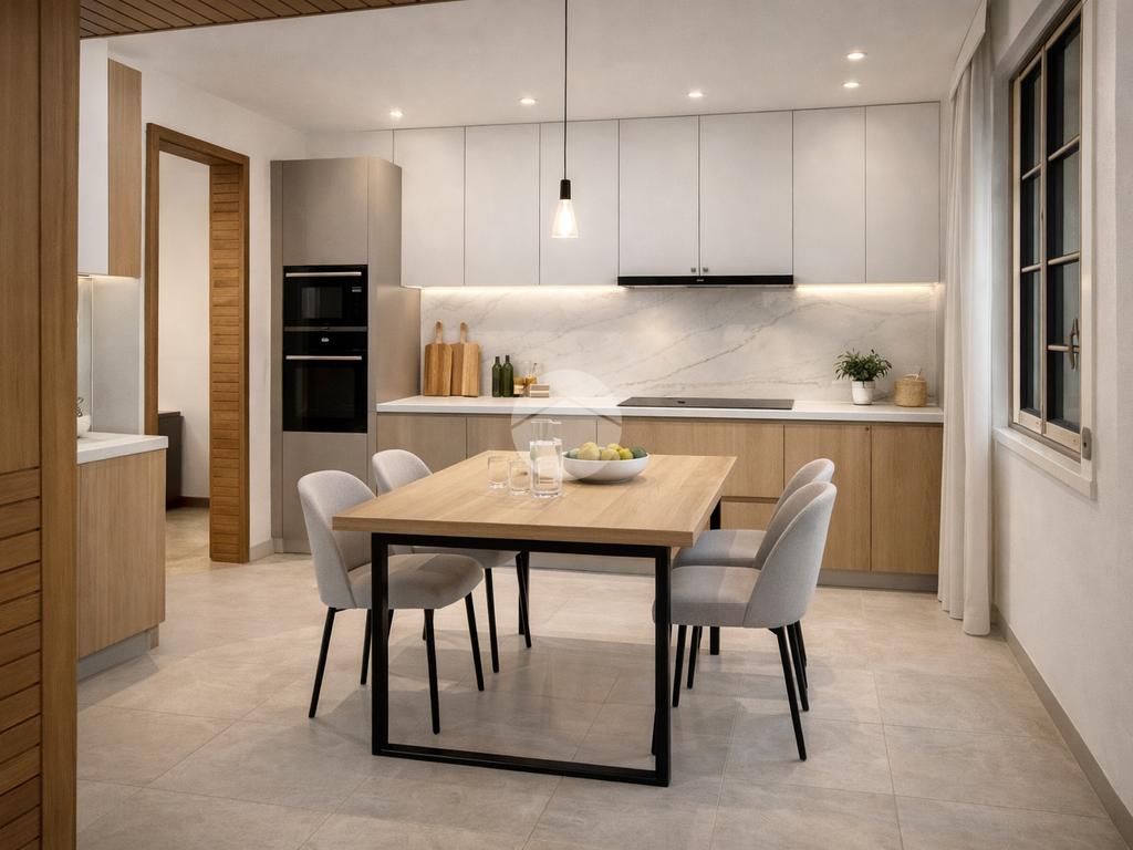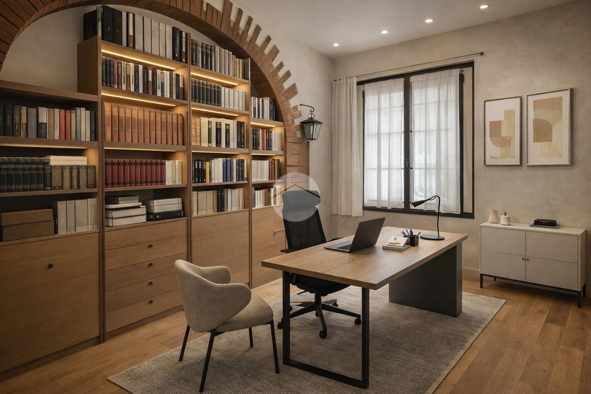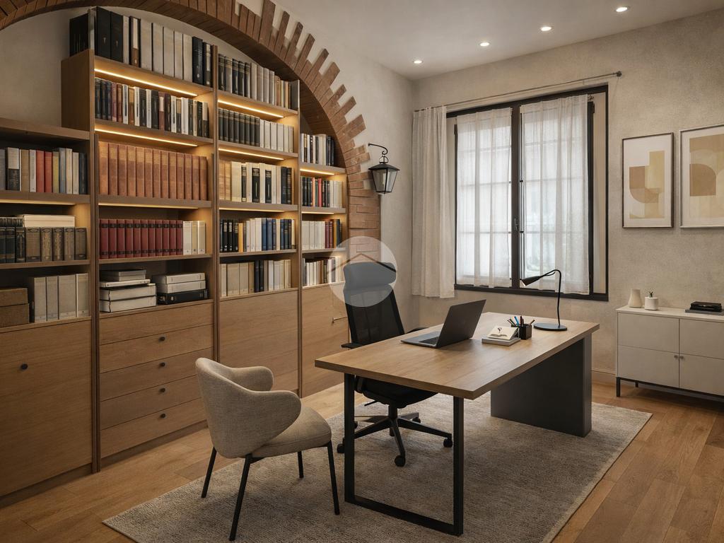 L'ingresso principale è composto da ampio disimpegno, salone doppio con zona pranzo e cucina abitabile; un corridoio conduce alle due camere matrimoniali, uno studio, ripostiglio e doppi servizi finestrati.